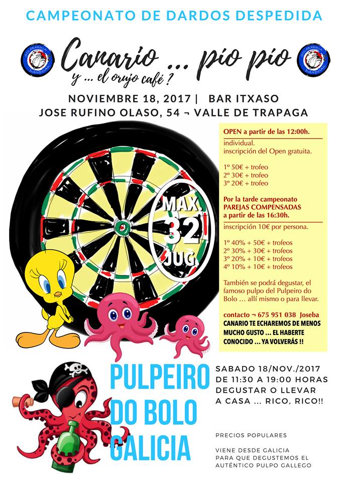 Campeonato de dardos despedida Canario Pio Pio, Bar Itxaso, Valle de Trápaga 0 by Fernando Sanchez in Eventos Punta Plastico · Featured — 17 Nov, 2017 Share Tags: Bar ItxasoCampeonato de dardos despedidaCanario Pio PioValle de Trápaga
