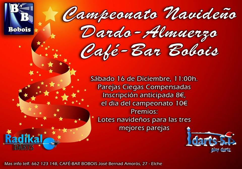 Campeonato de dardos Navideño Dardo-Almuerzo Café-Bar Bobois, Elche 0 by Fernando Sanchez in Eventos Punta Plastico — 8 Dec, 2017 Share Tags: Café-Bar BoboisCampeonato de dardosDardo AlmuerzoElcheNavideño