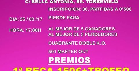 0 in Eventos Punta Plastico — 22 Mar, 2017 Torneo de dardos femenino Nueva Torrevieja, Torrevieja Leer mas